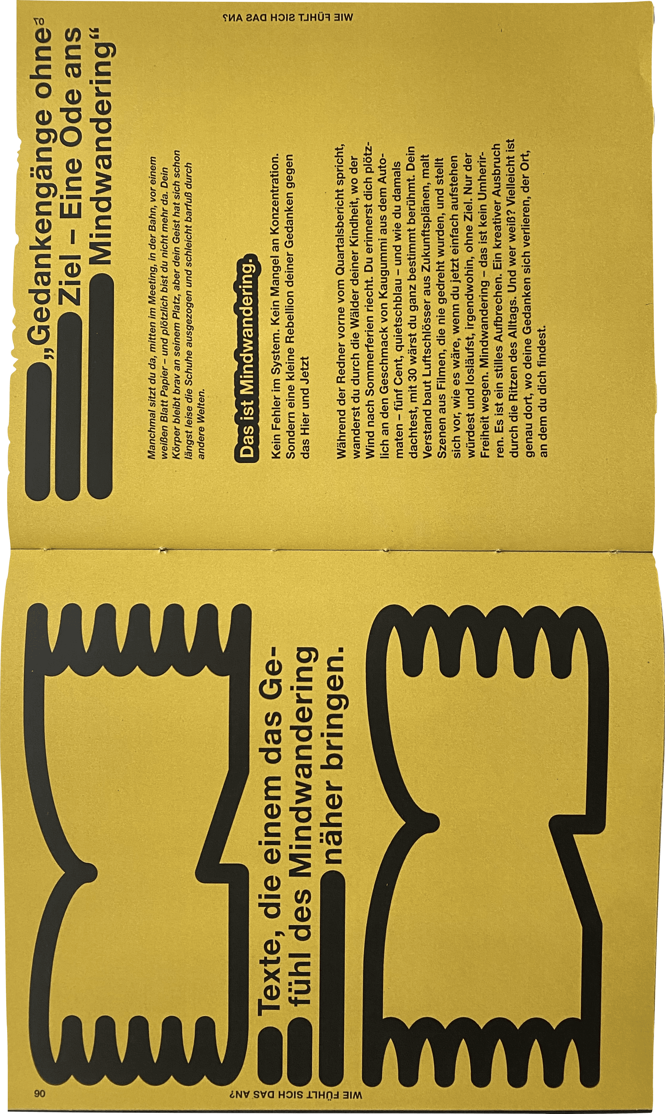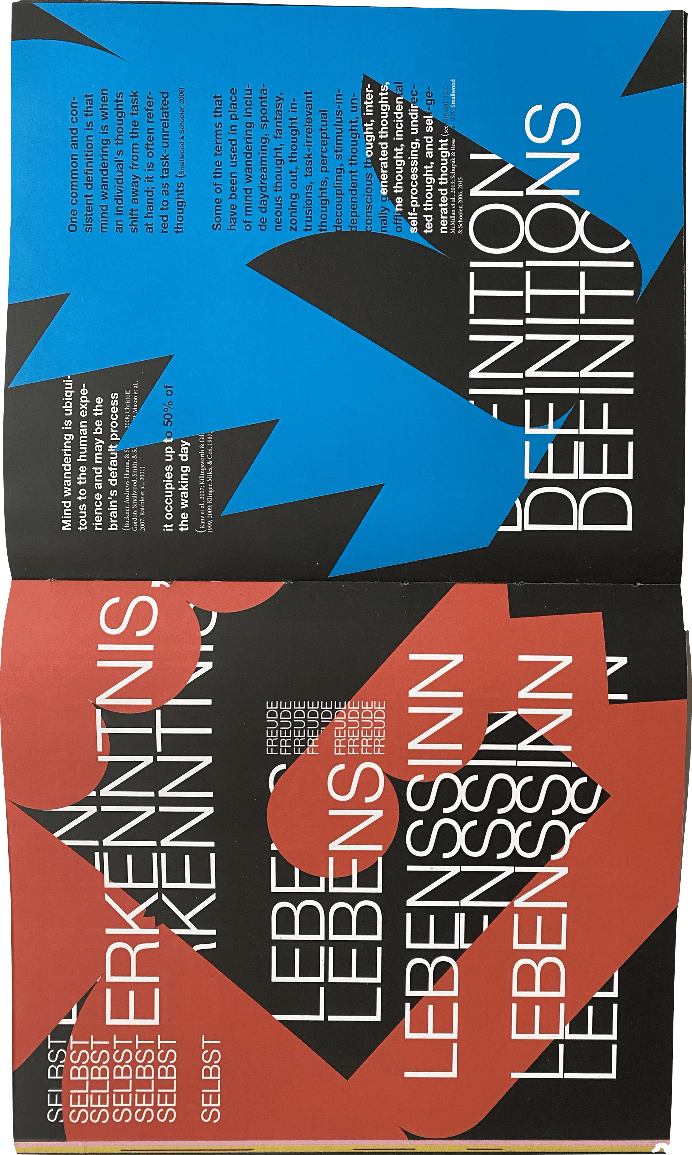 This project explores the feeling of mind-wandering. This dreamlike state of mind is displayed through a modular typography, which is featured in an animation and a print magazine filled with texts about mind-wandering.